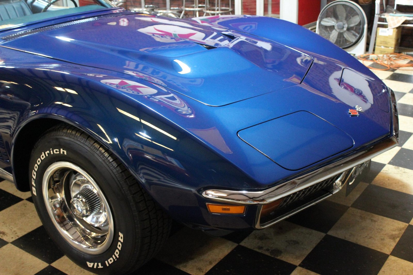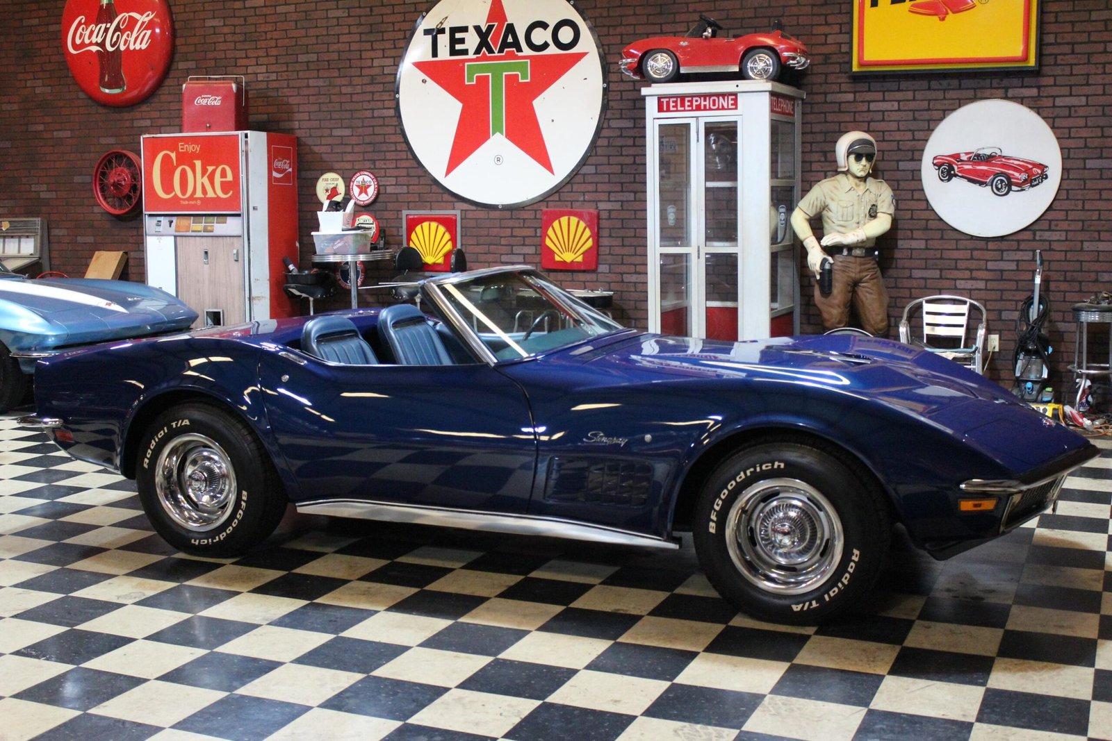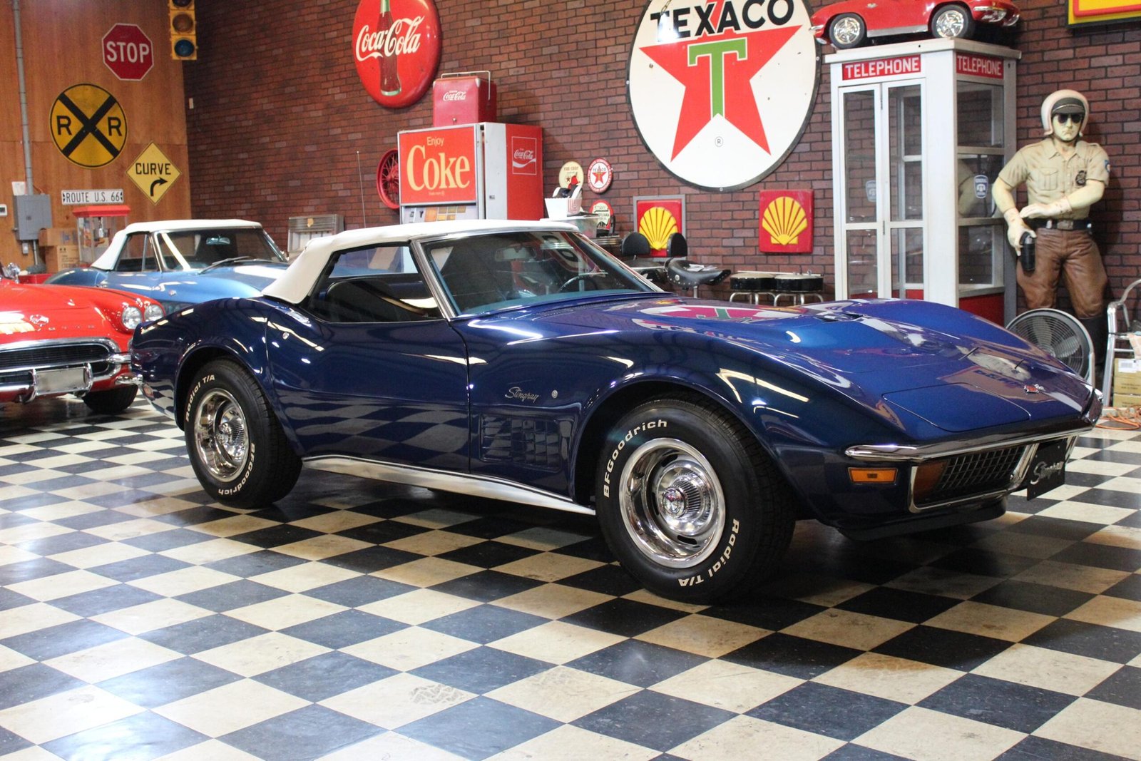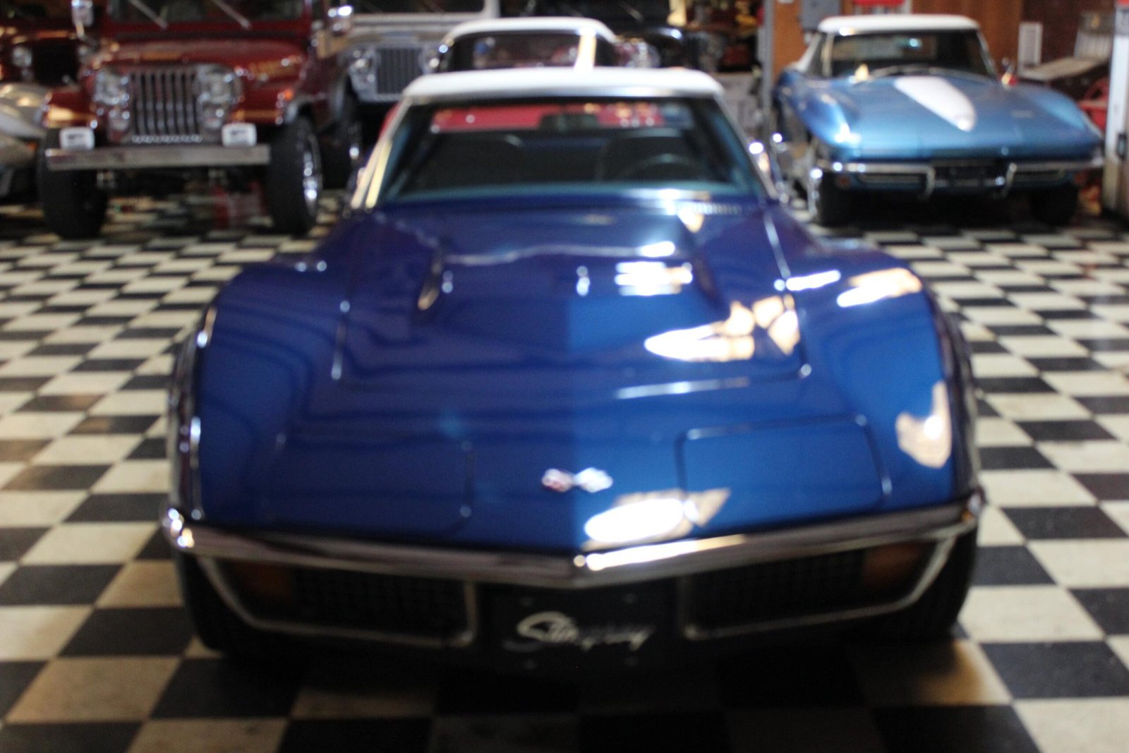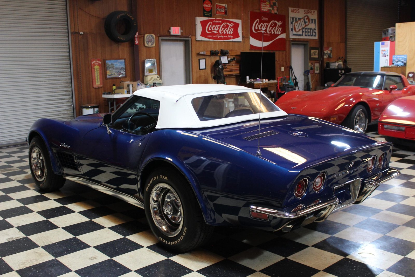 Up for sale is a 1972 Chevrolet Corvette Convertible. This Corvette is dressed in beautiful Blue paint over blue interior and white soft top. This is a matching number L48 350 V8 automatic transmission car that is nicely optioned with power steering, power brakes, AM/FM, tilt- telescoping. This car has very nice shiny paint with new interior, nice driver quality car. This car has a great look with seldom seen color combo that makes it really stand out. This is a great car to let the top down on nice days and just cruise, easy to drive. Ready to enjoy.