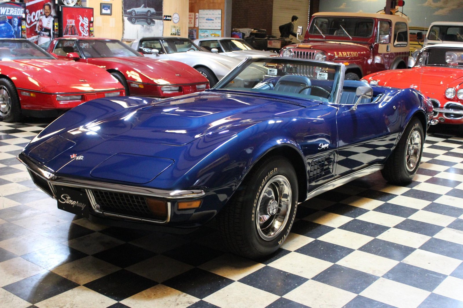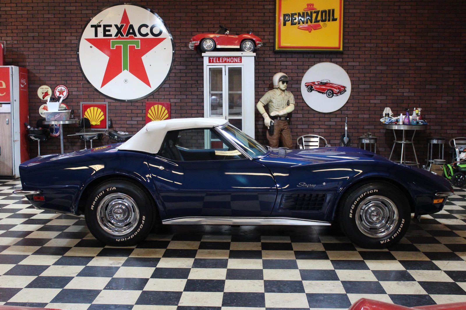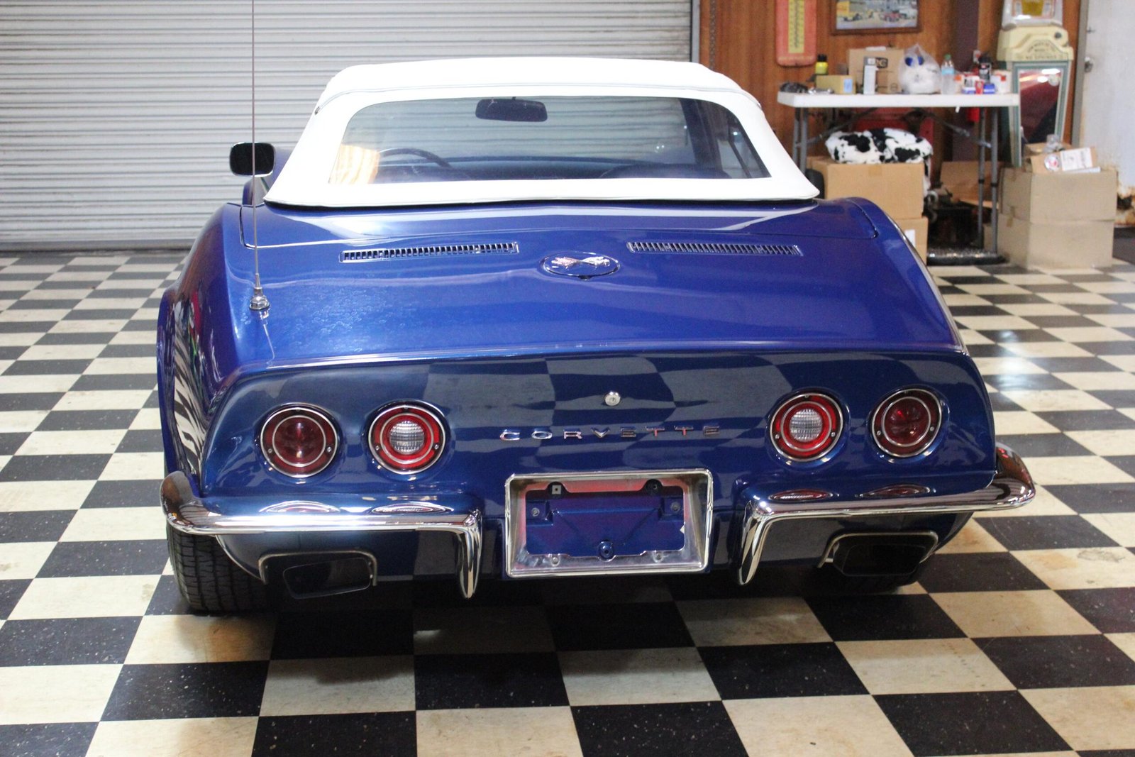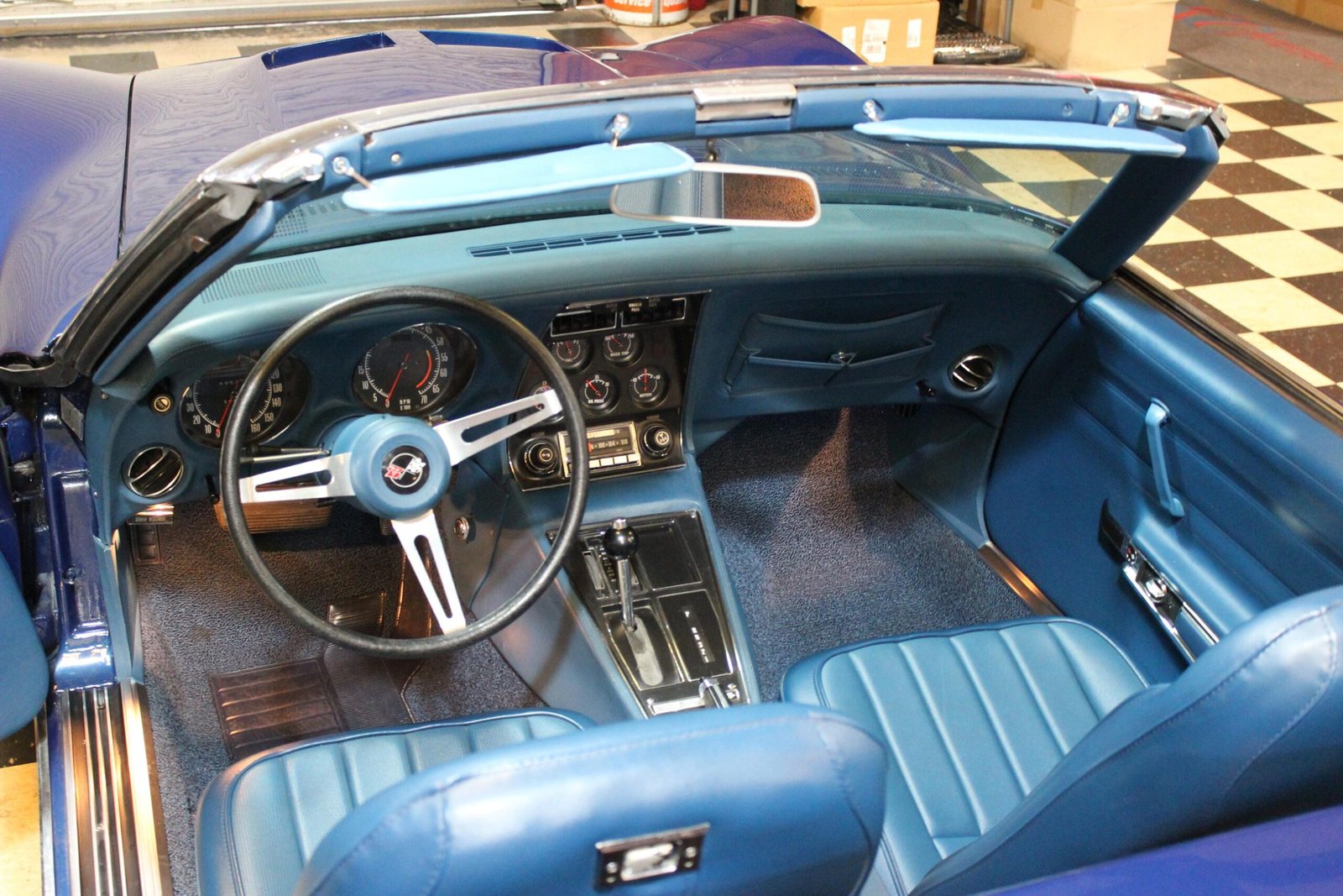 Up for sale is a 1972 Chevrolet Corvette Convertible. This Corvette is dressed in beautiful Blue paint over blue interior and white soft top. This is a matching number L48 350 V8 automatic transmission car that is nicely optioned with power steering, power brakes, AM/FM, tilt- telescoping. This car has very nice shiny paint with new interior, nice driver quality car. This car has a great look with seldom seen color combo that makes it really stand out. This is a great car to let the top down on nice days and just cruise, easy to drive. Ready to enjoy.