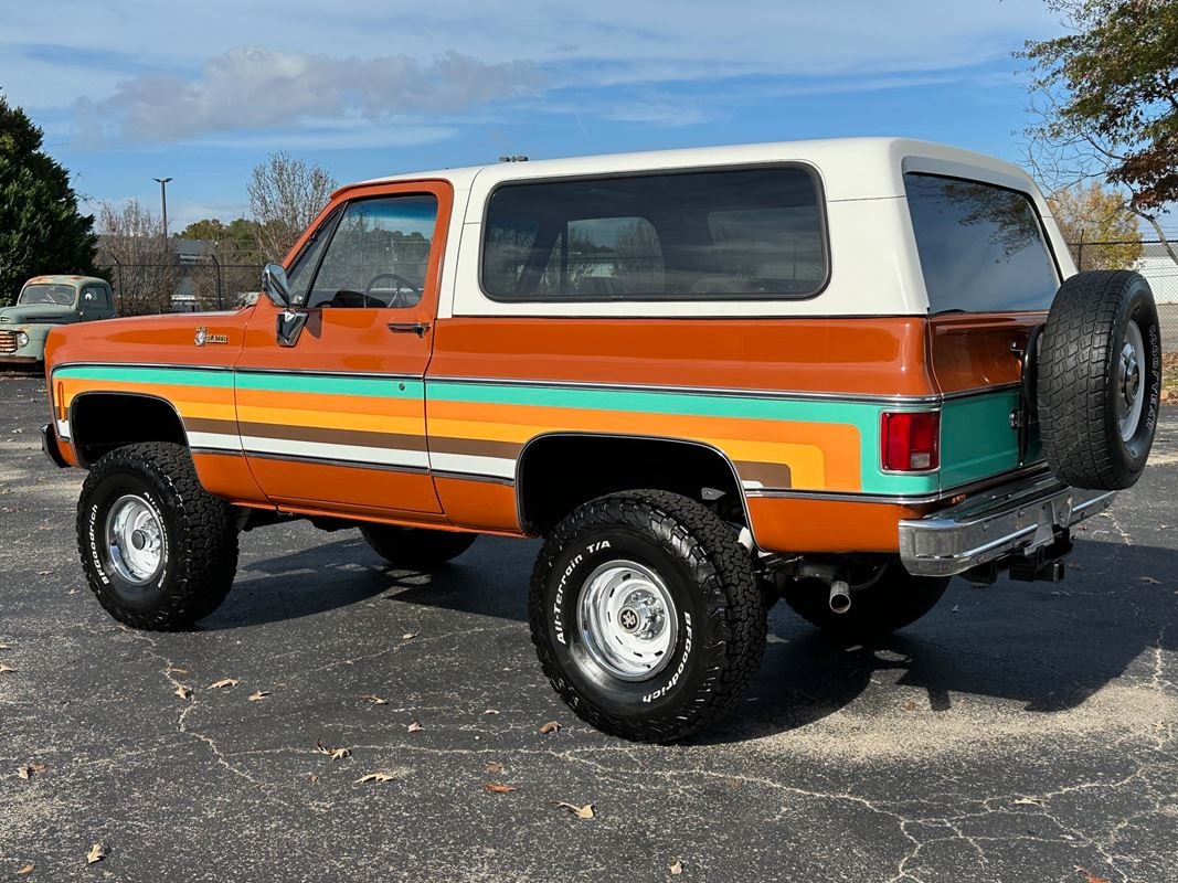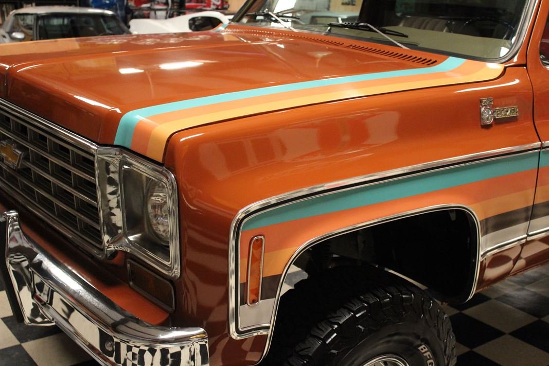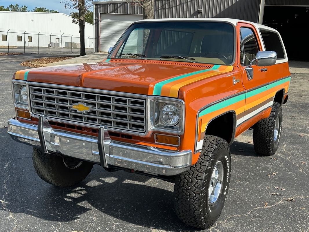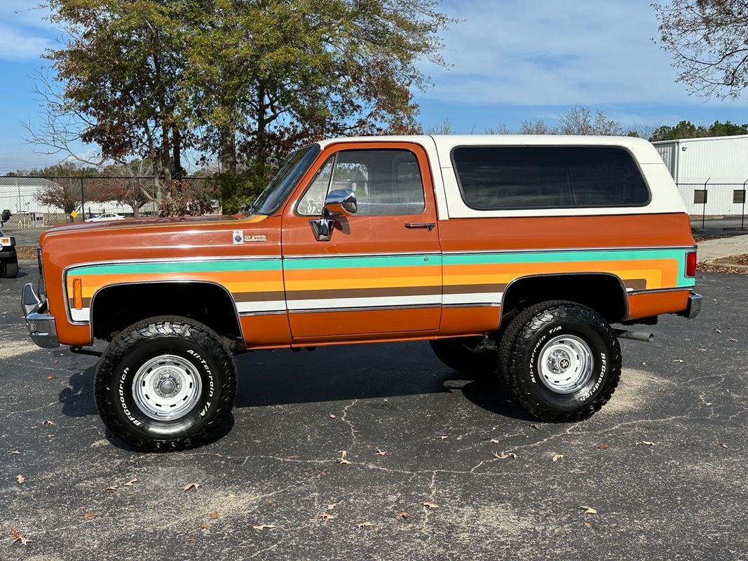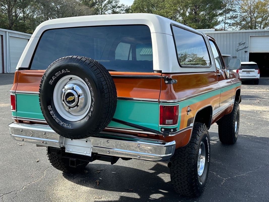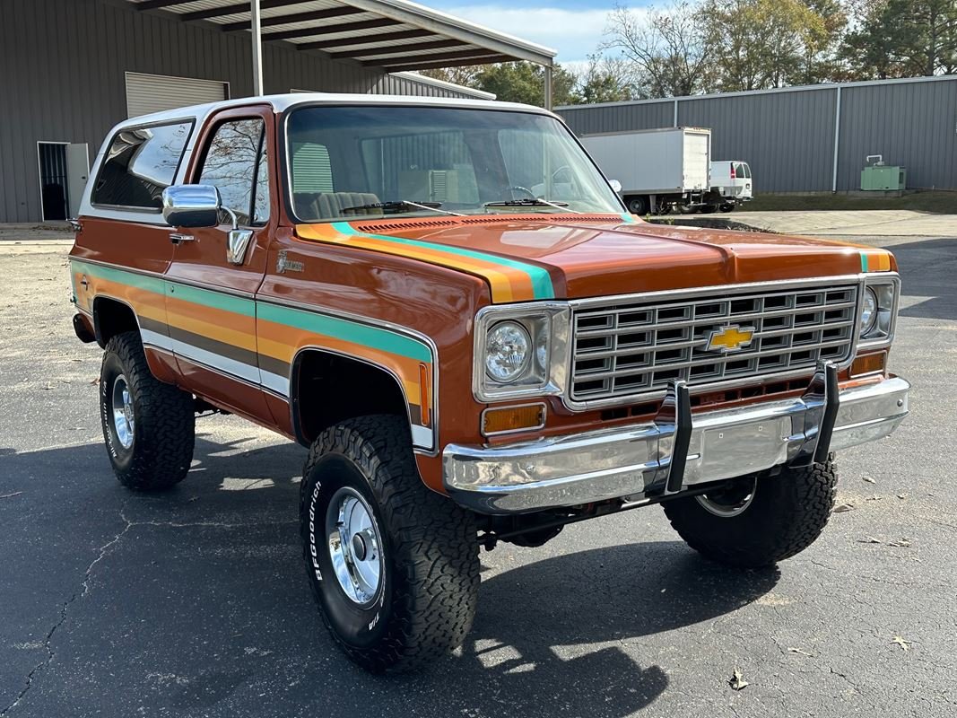 Up for sale is a 1976 Chevrolet K5 Blazer. This stunning K5 Blazer is dressed Grecian Bronze paint with custom original style decals and Saddle interior. This K5 Blazer is nicely optioned with 350 V8 engine, automatic transmission, power steering and power brakes. The motor, transmission and transfer case has been rebuilt on this blazer. When the motor was rebuilt Sniper Holley fuel injection was added to make it a more reliable and easier drive. This Blazer has a 4 inch lift with nice Bfgoodrich tires. This is a very nice K5 Blazer with a unique and stunning look. You will not pass another one like this on the road. Great color combination. This Blazer is a ready to drive and enjoy or take to a local car show and be the center of attention.
